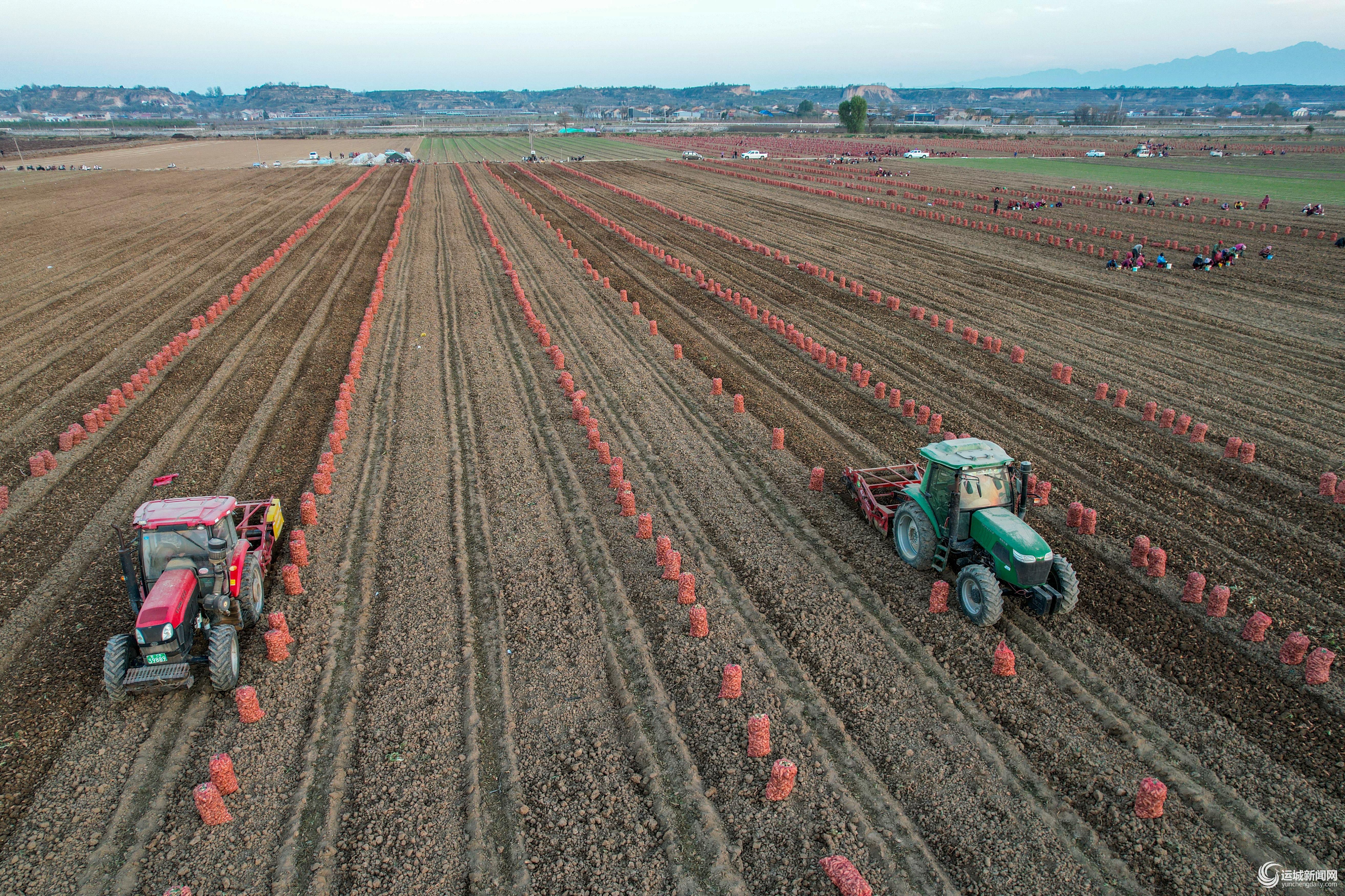 11月23日,永济市黄河滩涂,农机穿梭田间,工人忙着将中药材地黄挑拣、装袋。一袋袋整齐码放的地黄与远处的麦田相映,绘就初冬农忙图景。特约摄影 刘宝成 摄