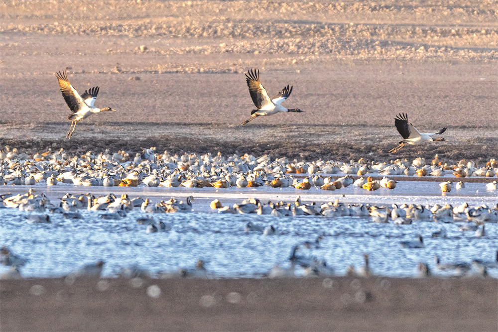 冬日时节,拉萨市林周县迎来大批越冬候鸟,黑颈鹤、斑头雁、赤麻鸭等候鸟在河谷、湖泊等地觅食、休憩。 新华社记者 姜 帆 摄