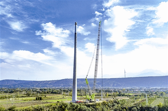 11月23日,灵宝市豫灵镇庙上村正在建设施工风力发电设施。