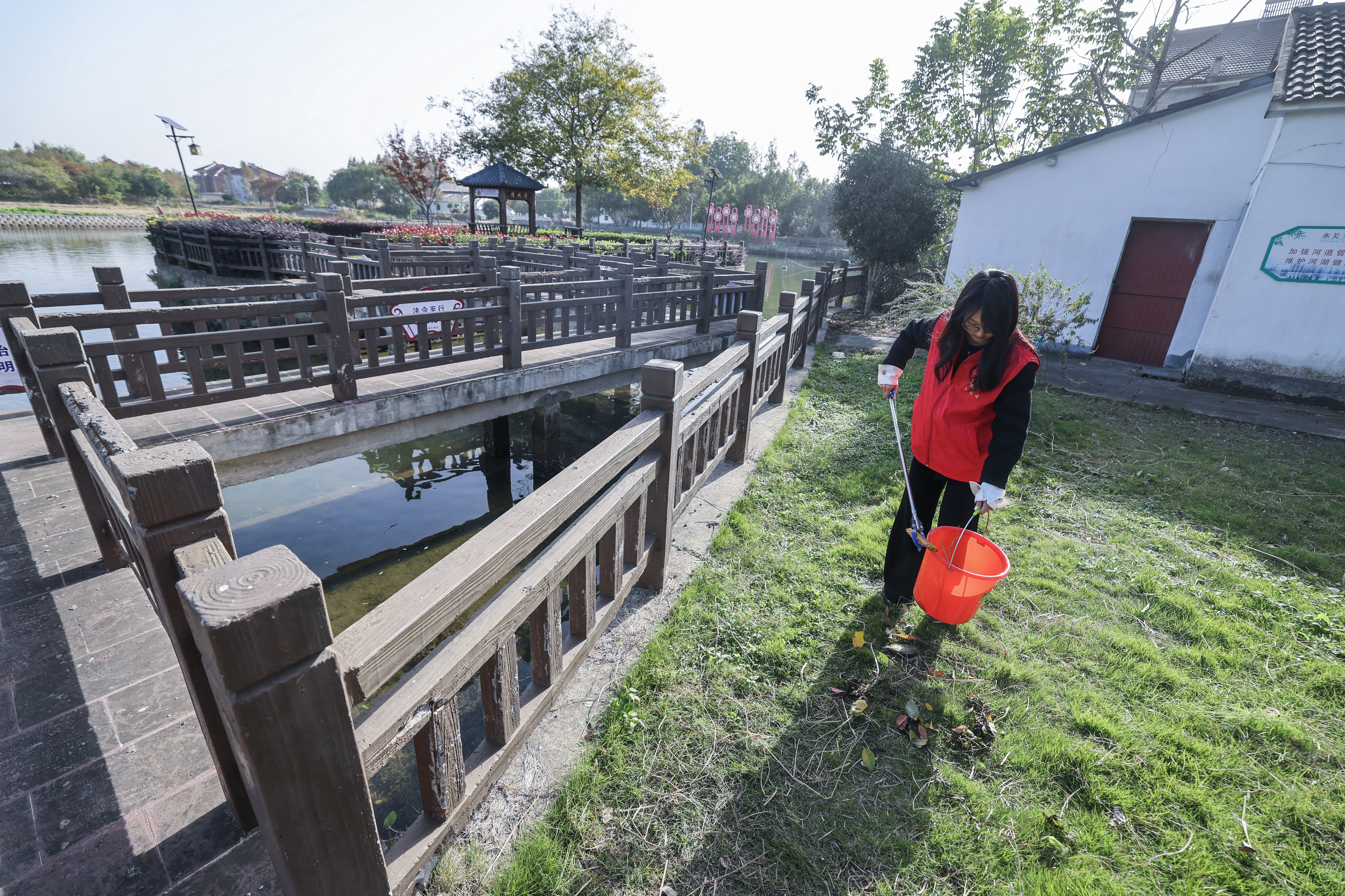 11月25日,浙江省湖州市长兴县和平镇长城村党员志愿者在河岸旁清理垃圾杂物。