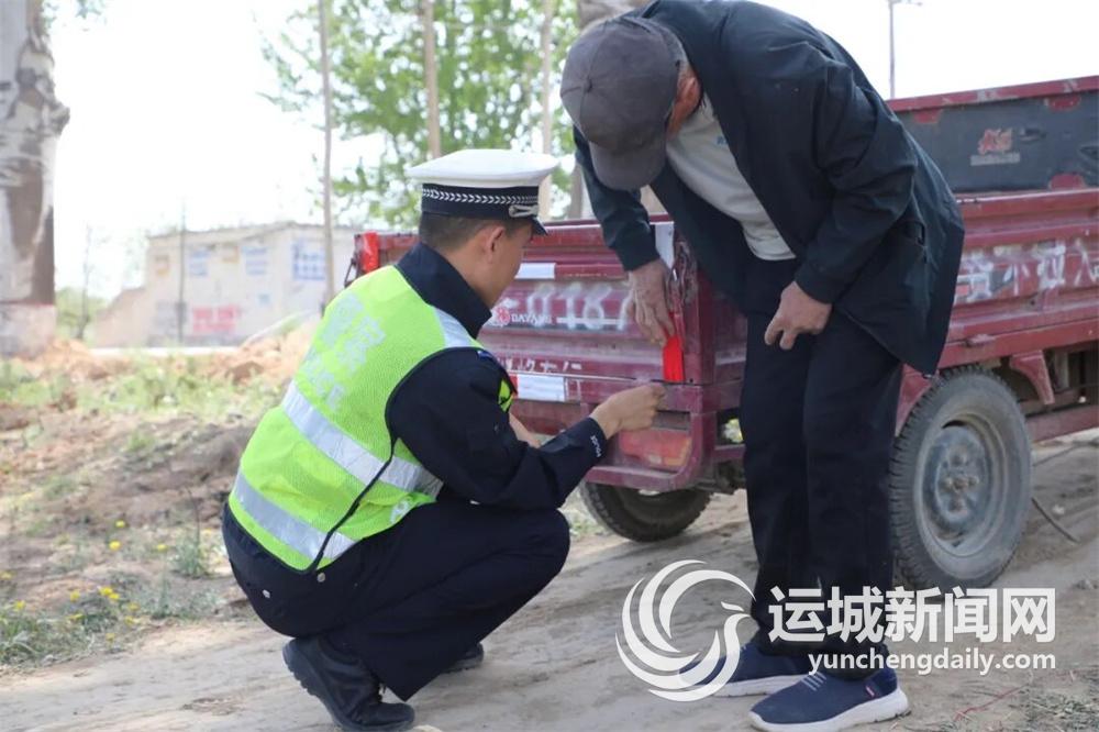 在临猗县孙吉镇的村道上,临猗县公安局交管大队民辅警正弯腰为一辆三轮车张贴反光条,车尾新喷的编码在阳光下格外醒目。