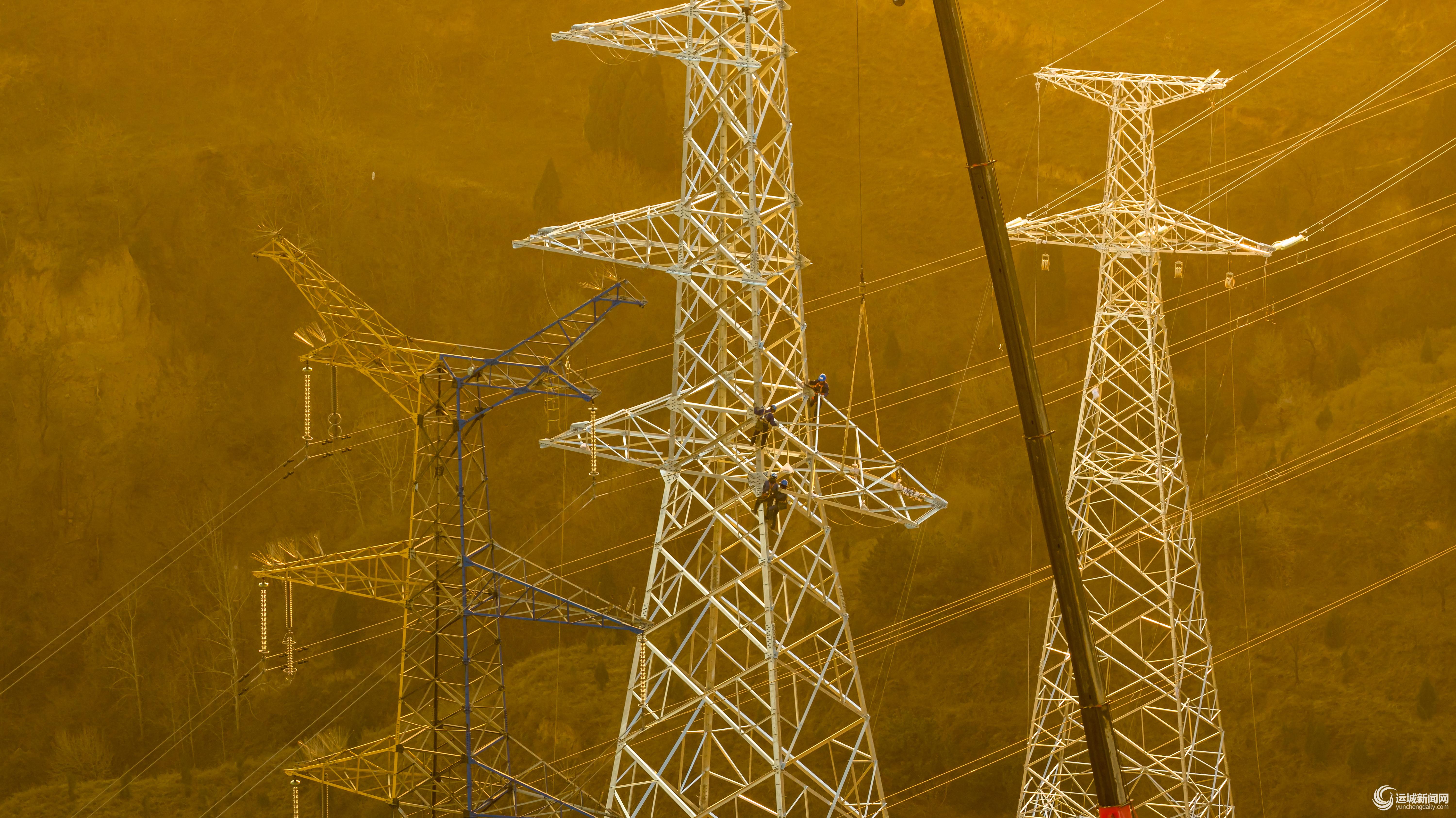 11月25日,在运城220千伏桃平一二线防覆冰改造工程施工现场,国网运城供电公司组织施工人员进行铁塔组立作业。