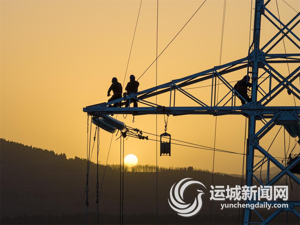 11月24日,国网运城供电公司施工人员在山西运城220千伏桃平一二线防冰改造工地进行导线紧挂线作业。