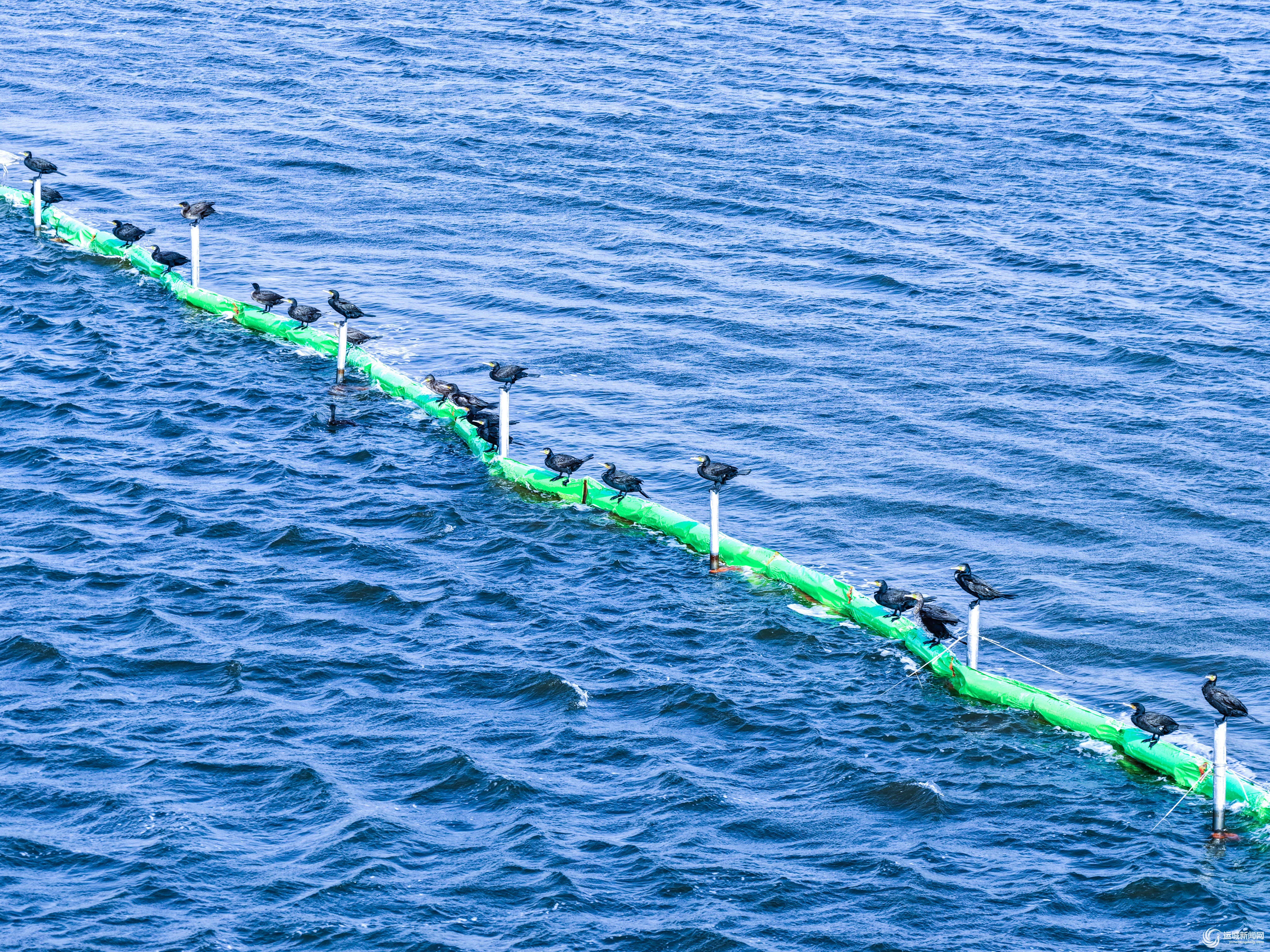 11月26日,永济市伍姓湖湿地,成群鸬鹚昂首挺立,整齐排列于湖心一道围栏上,宛若列队受阅的仪仗队,静穆而庄严。