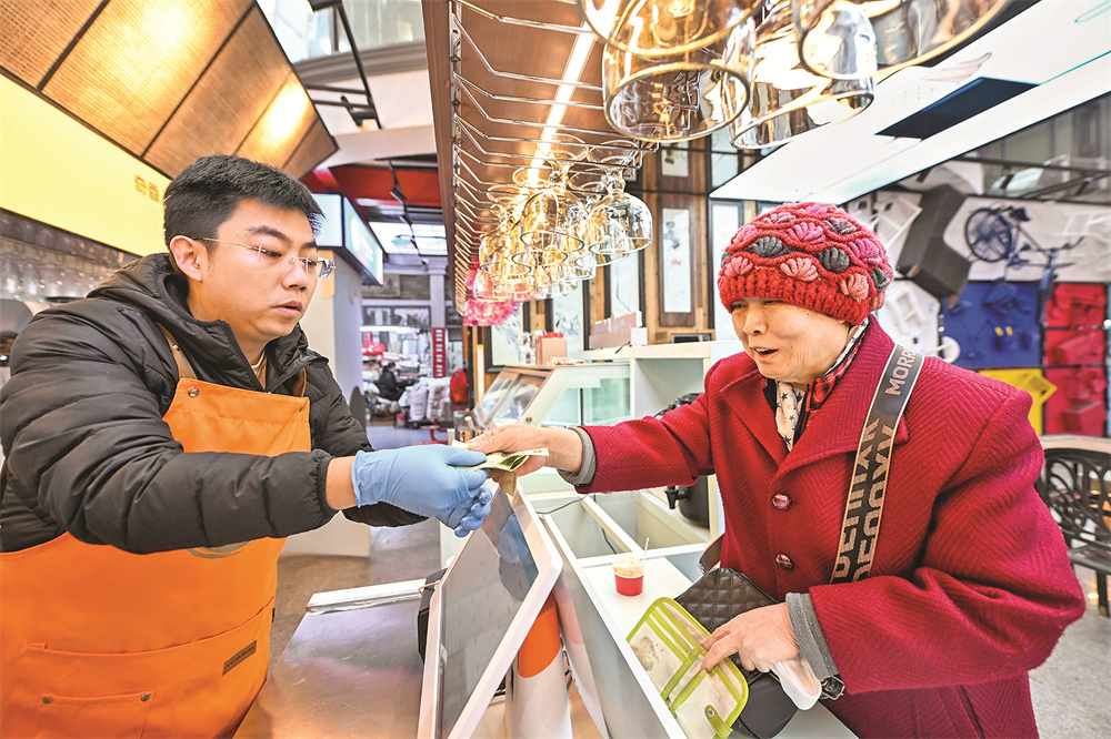 11月25日,一名老年人在天津市河西区“美丽的菜市场”付钱购物。