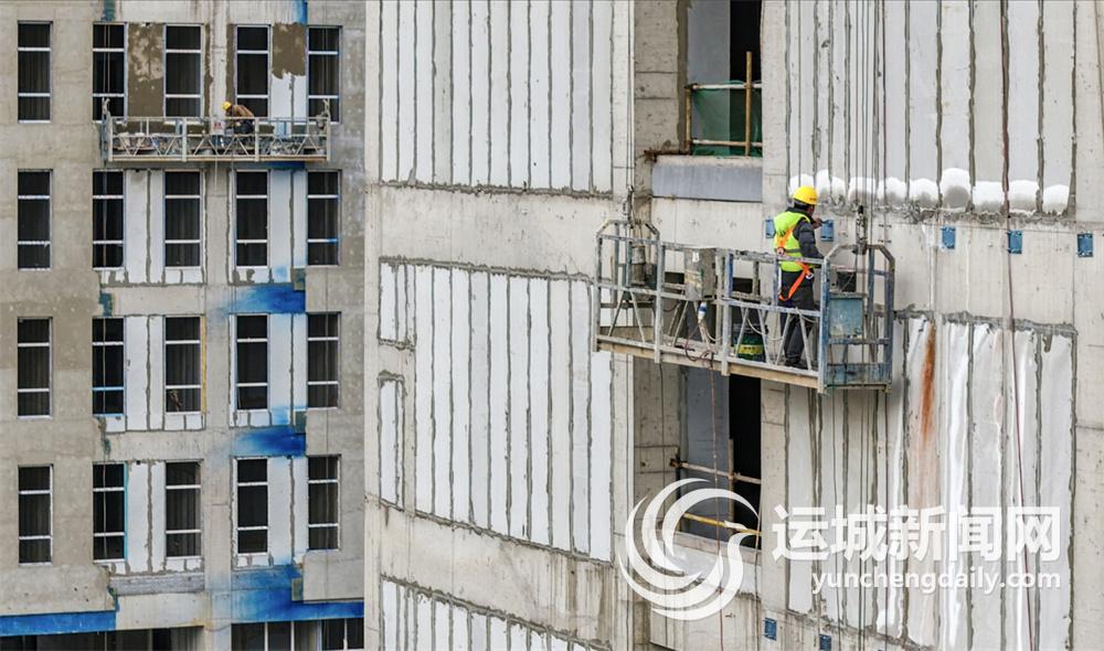 11月27日,万荣现代农业产业示范区检验检测及公共服务平台基础设施建设项目工地上,工人在进行外立面施工。