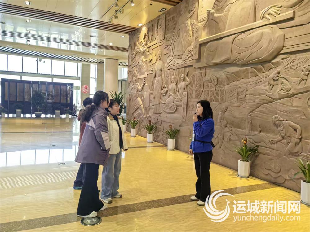 志愿者高亚娜为观众讲解序厅浮雕墙发生在河东大地的历史神话传说