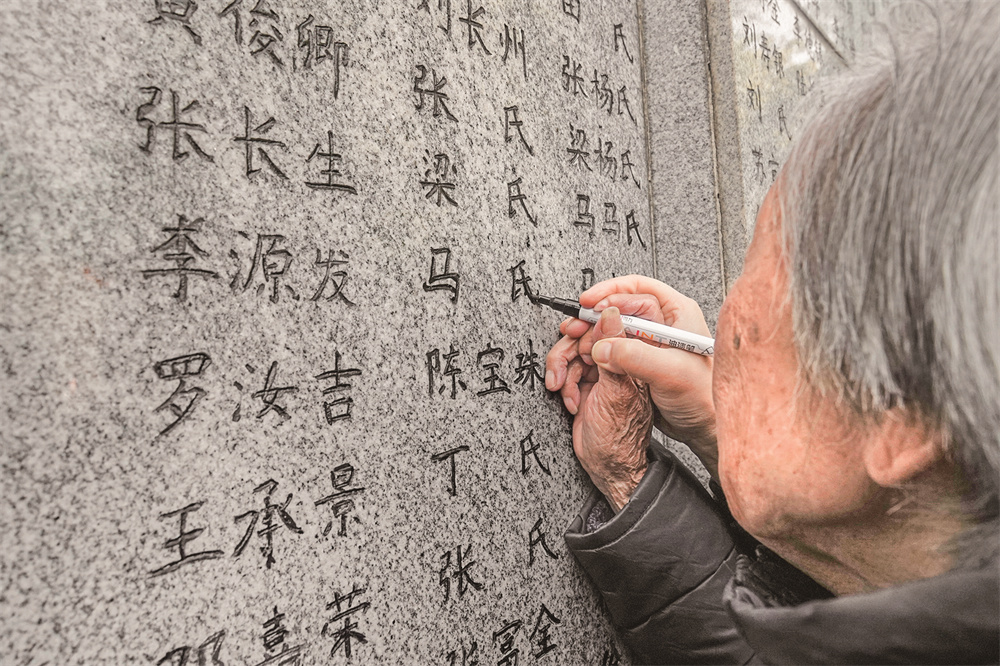 11月30日,南京大屠杀幸存者夏淑琴在“哭墙”上描名。