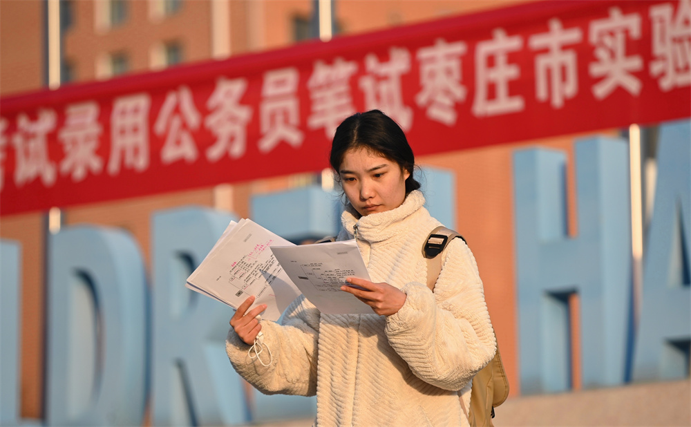 11月30日,在山东省枣庄市实验小学(薛城)考点,一名考生在入场前复习。