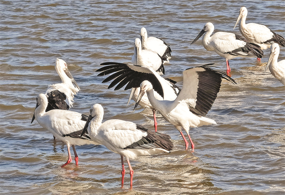 近日,大批东方白鹳飞抵河北省唐山市丰南区沿海湿地觅食、停留,形成一道亮丽的风景。