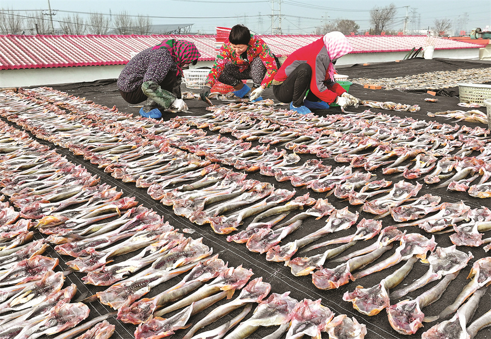 初冬时节,河北省唐山市丰南区黑沿子镇的渔民利用晴好天气,将捕捞的鱼虾等海产品进行加工、晾晒,供应市场。