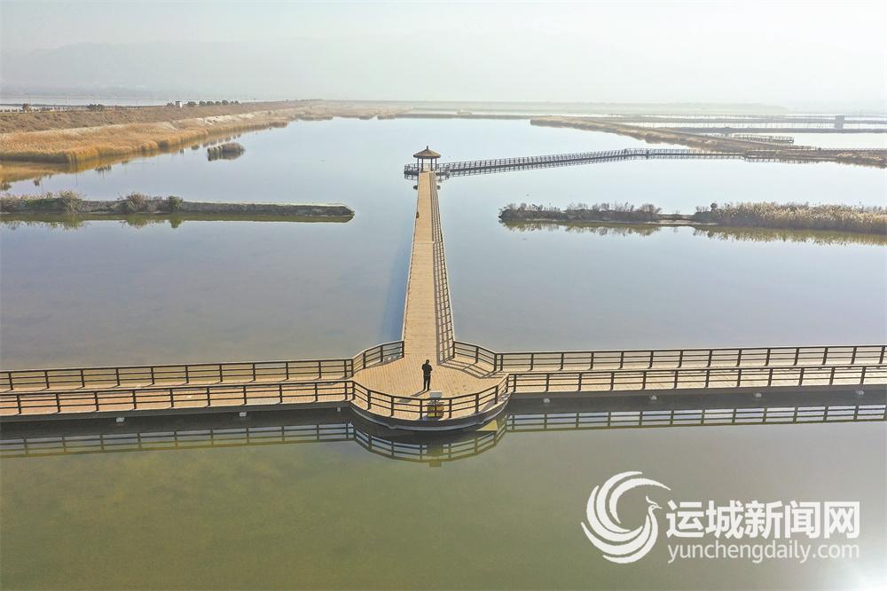 近日,航拍镜头下的运城盐湖冬日风光。木栈道宛如银色丝带,蜿蜒穿梭于碧波之上,串联起湿地、芦苇荡等自然景观,让冬日盐湖呈现出别样景致。 特约摄影 郝健