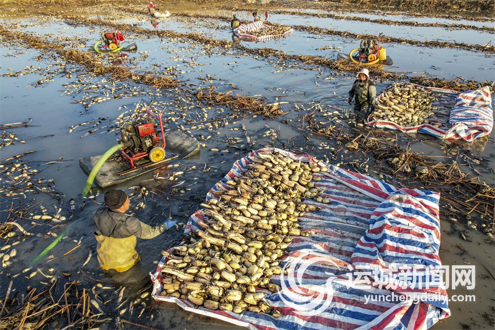 11月30日,种植户在永济市韩阳镇黄河滩采收莲藕。