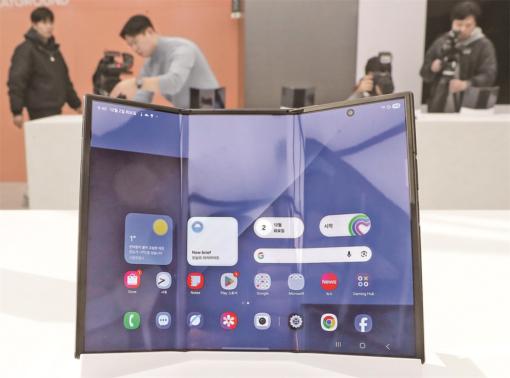 这是12月2日在韩国首尔拍摄的三星三折叠手机。当日,韩国三星电子在首尔举行新品发布会,发布了旗下首款三折叠手机,售价为3590400韩元(约17305元人民币)。 新华社记者 姚琪琳 摄