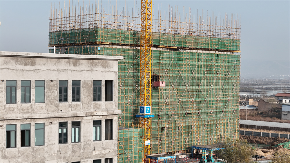 寒冬时节,位于夏县裴介镇师村的黄河金三角智能制造产业园项目施工现场,外墙保温材料安装、物料搬运等作业有序开展。