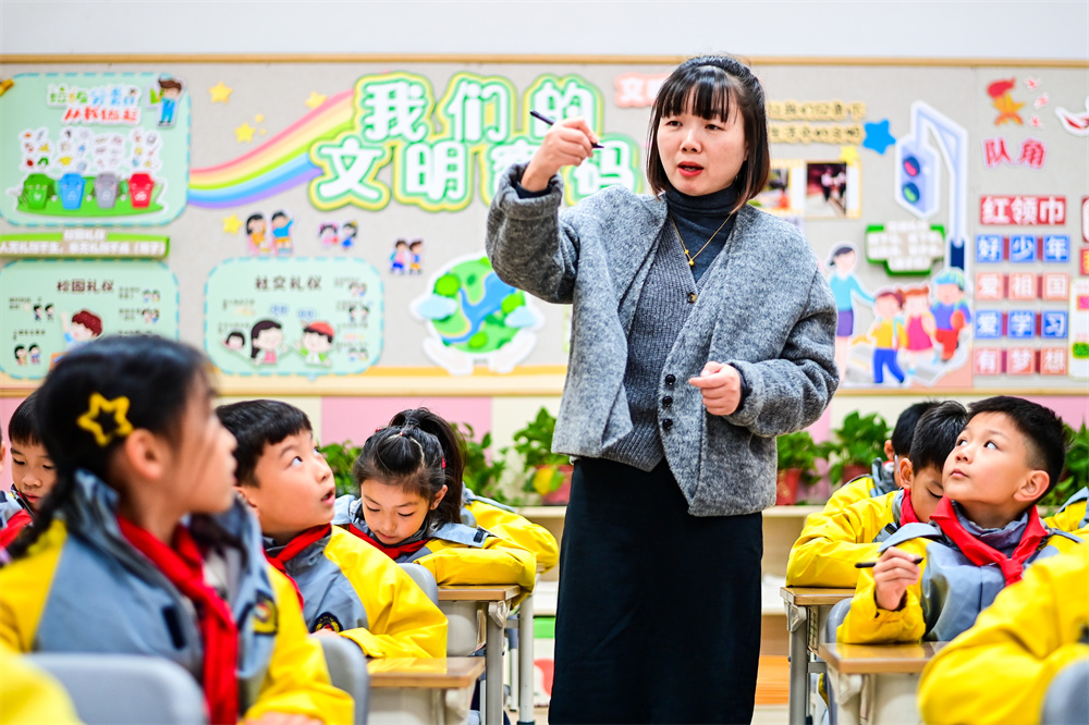 12月3日,浙江省杭州市长寿桥岳帅小学的教师在课堂上教导学生们如何使用智能笔答题。通过这种智能笔,教师可以实时关注学生的答题情况与正确率,增加课堂的趣味性与学生们的参与度。 新华社记者 江 汉 摄