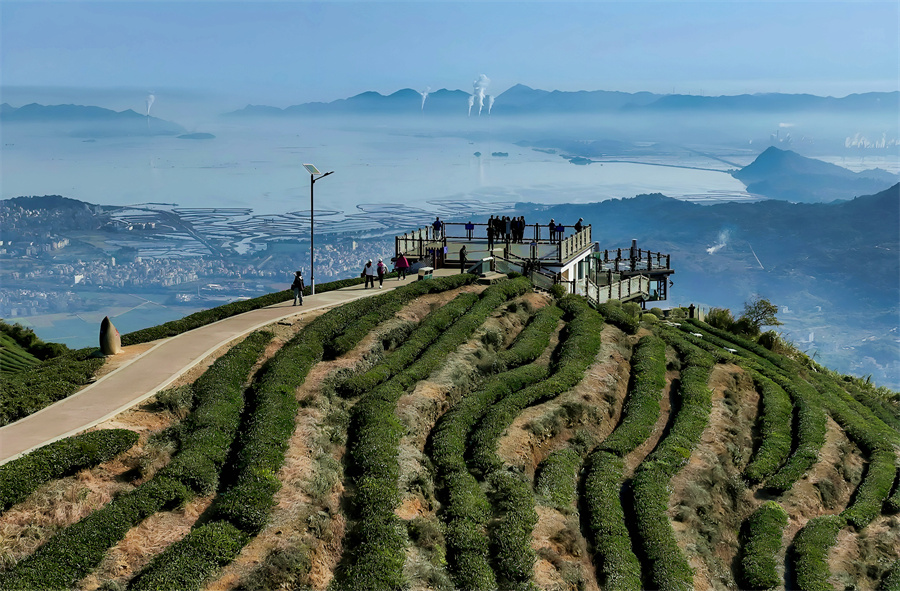游客在位于福州市连江县炉峰山上的观景平台观赏山海风景(12月6日摄,无人机照片)。