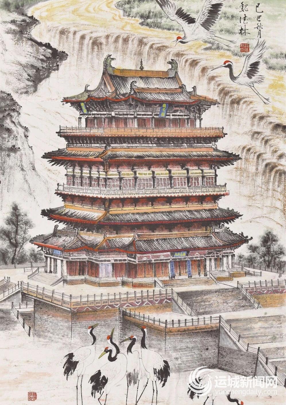展厅之中,《中条泛舟》《虞坂古盐道》《司马温公祠》《稷山大佛》《禹王台》等作品各具特色、熠熠生辉,笔触间既有写实手法的细腻描摹,又有写意风格的磅礴气势,有的作品精细描绘殿宇飞檐的精巧结构,有的作品纵情挥洒山河古迹的雄浑气魄。艺术家们坚守传统笔墨精髓,又融入创新表达手法,以多元艺术语言构建起立体生动的“河东图景”,让观众仿佛穿行于运城的历史长河与当代烟火之中。夏县美协副主席王丹的工笔重彩《司马温公祠》从构思到完成历时一个月,她精心遴选了具有代表性的杏花碑楼、门楼及涑水书院等元素,将其富有层次地镶嵌在山川的掩映之中,王丹表示:“夏县被誉为运城的后花园,我也想通过作品让更多人了解夏县优美的景色和深厚的人文底蕴,了解既古老又有活力的夏县。”