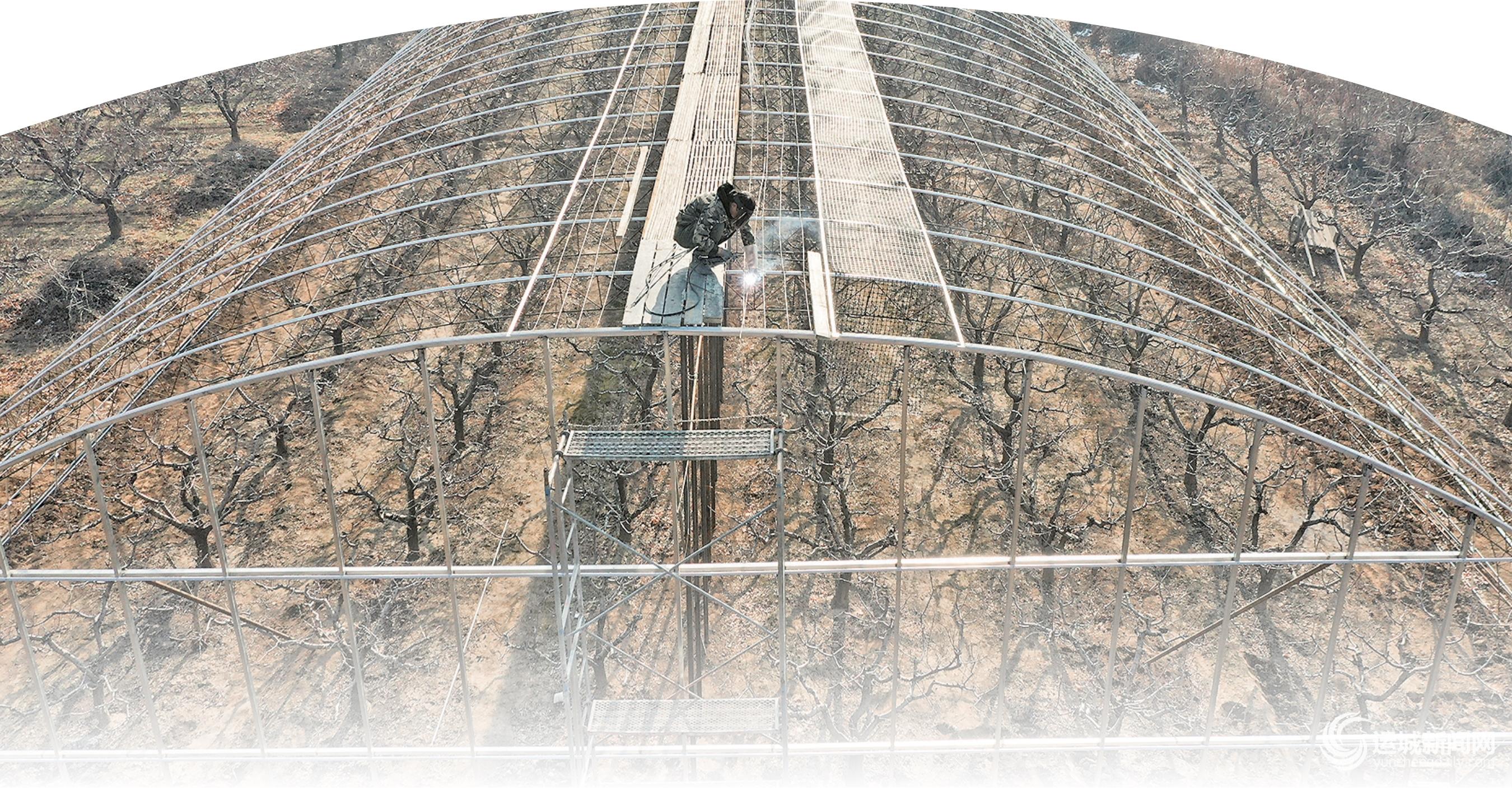 近日,夏县瑶峰镇北山底村杏树基地,村民在为杏树搭建全自动设施暖棚。近年来,夏县瑶峰镇北山底村依托日照充足、昼夜温差大的气候优势,发展了千亩“金太阳”优质杏果基地。每年4月中旬,鲜杏即可抢先上市,已成为当地村民增收致富的特色产业。 特约摄影 张秀峰 摄