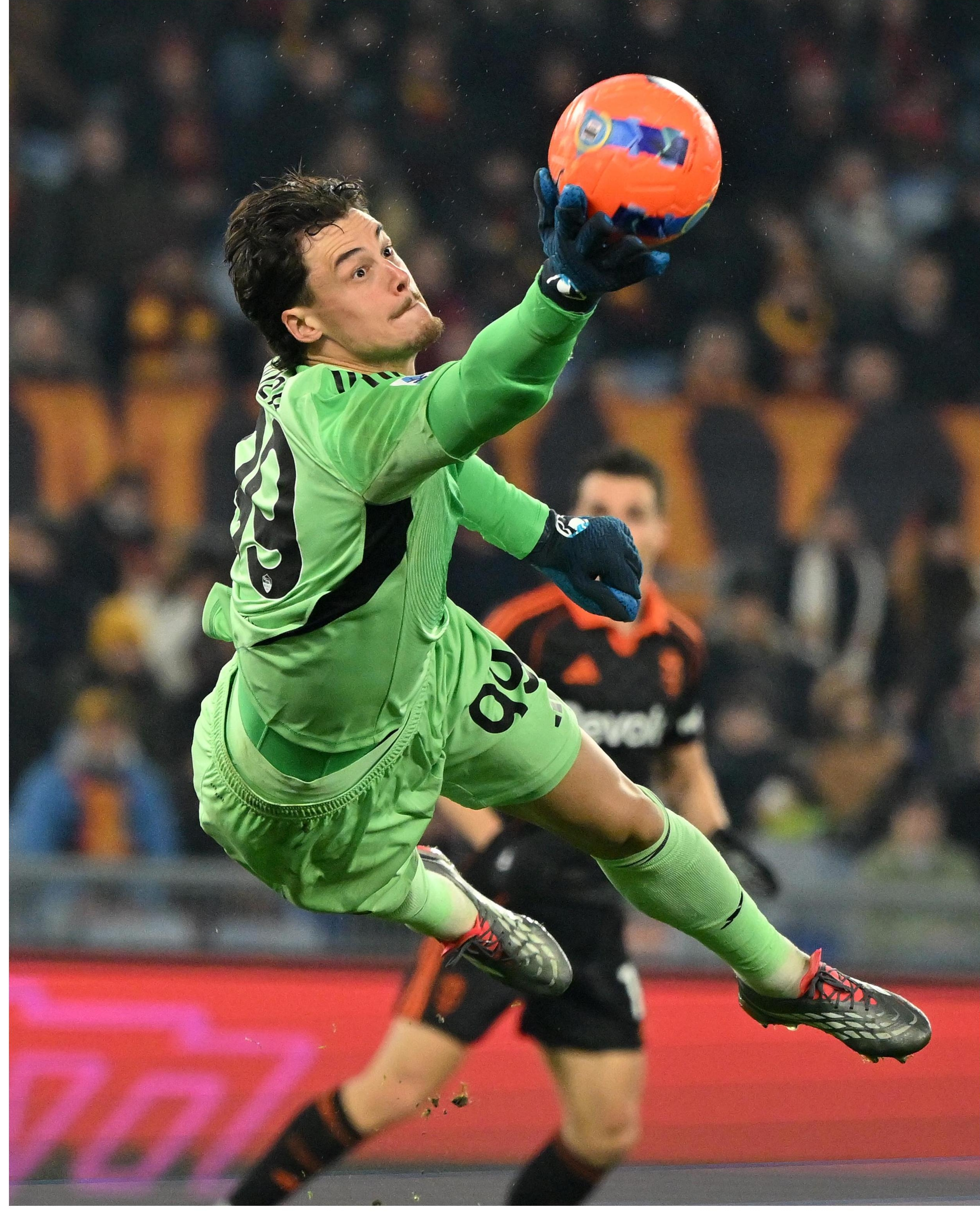 12月15日,罗马队守门员斯维拉尔在比赛中扑救。当日,在2025-2026赛季意大利足球甲级联赛第15轮比赛中,罗马队主场1比0战胜科莫队。 新华社发
