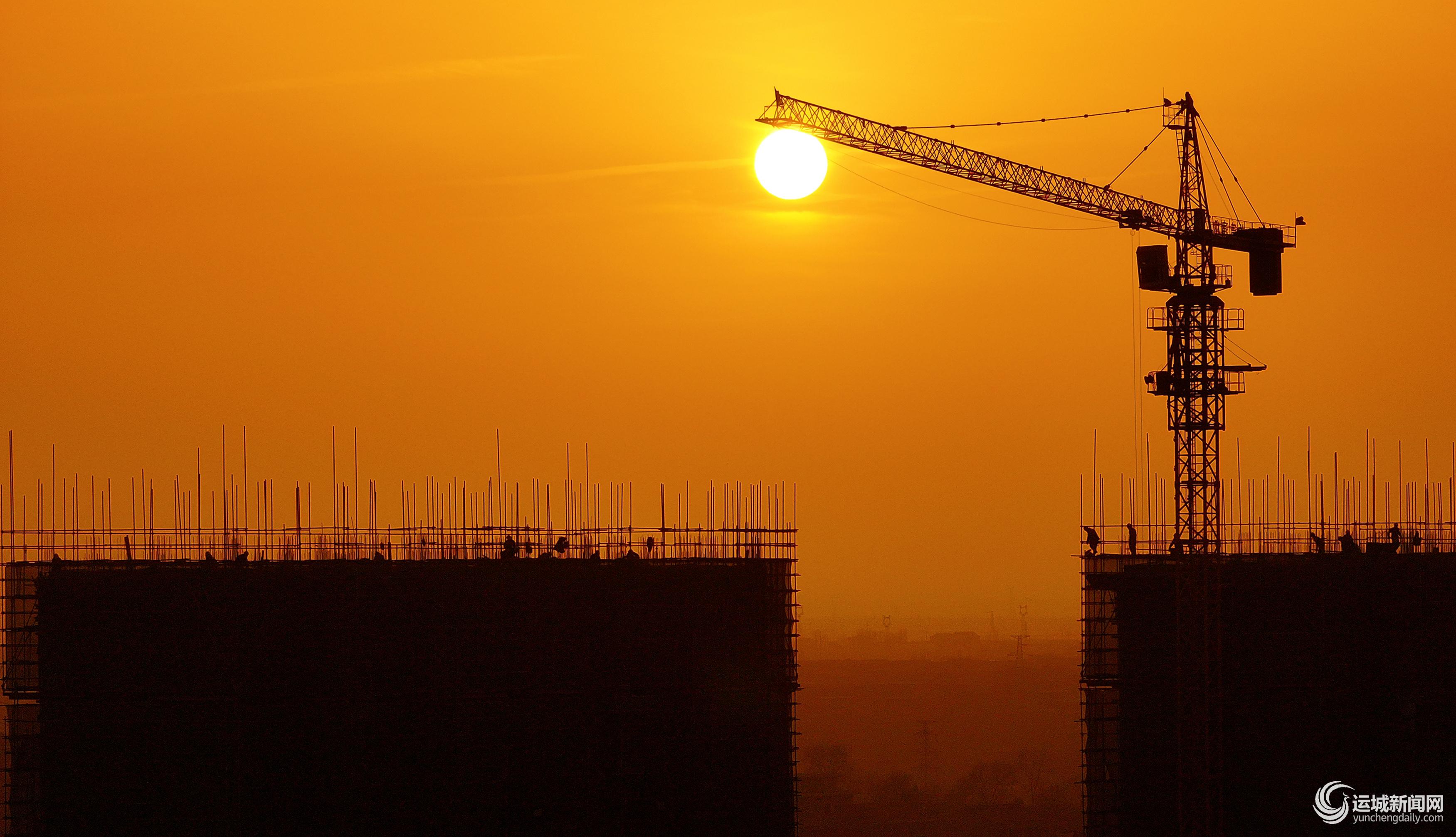 12月23日,夕阳和晚霞中,施工人员在新绛县强绛富民重点工程现场加紧施工。