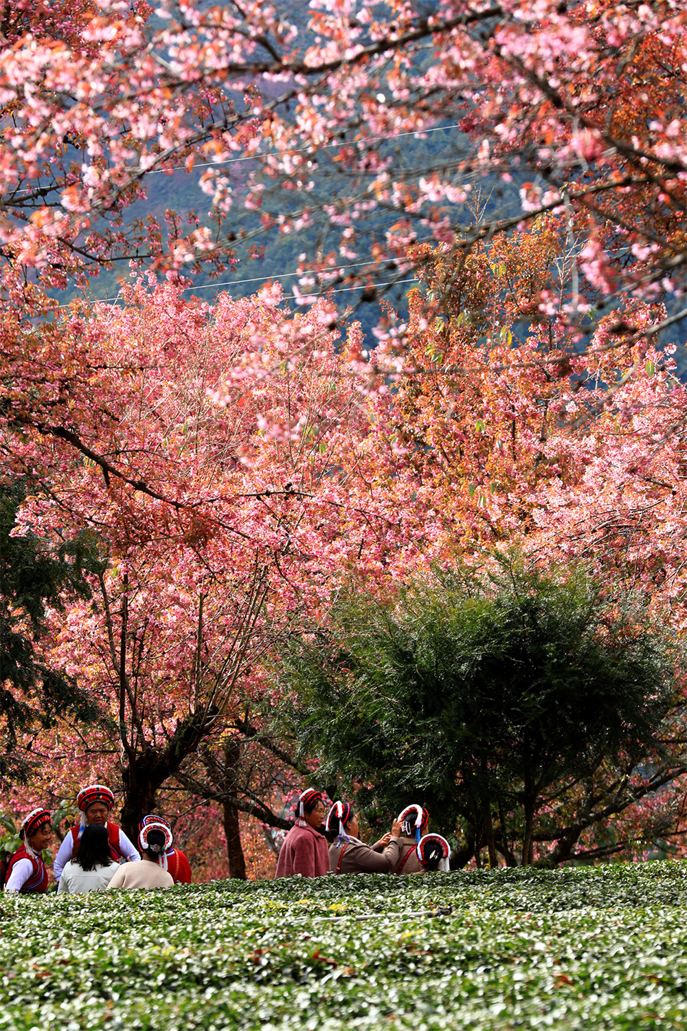 进入12月,云南省大理白族自治州南涧彝族自治县无量山樱花谷的冬樱花陆续绽放,与茶园、云海构成一幅美丽的山水画卷。