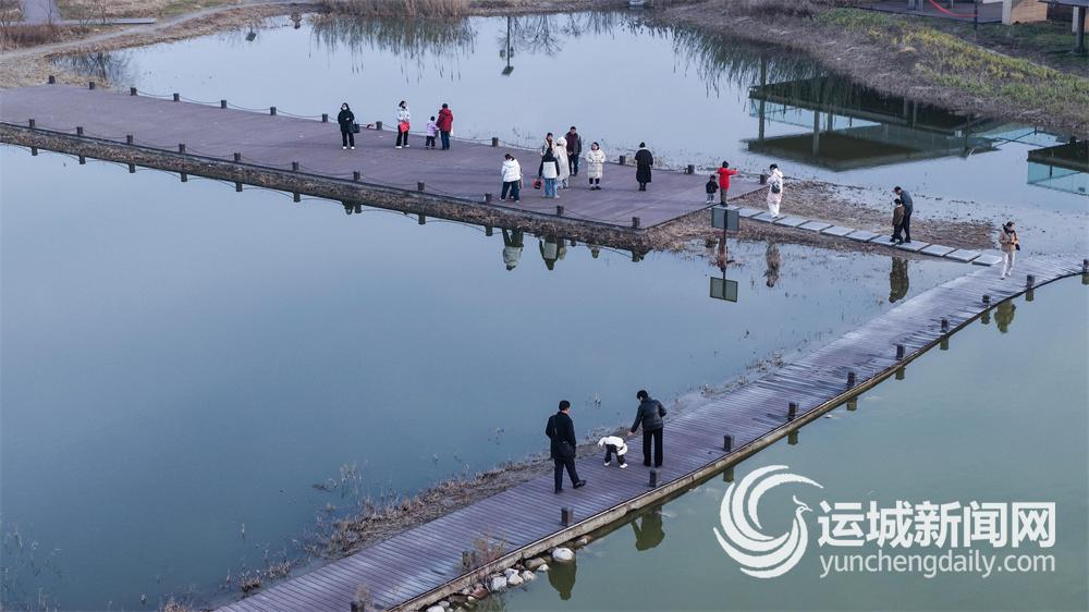 12月19日,永济市伍姓湖湿地的湖中栈道在蓝天的映衬下风采尽显。游人漫步其上,赏景怡情,人与景交融共生,宛如凌空楼阁,恍若天宫仙境,绘就一幅和谐的生态画卷。 程永仁 摄