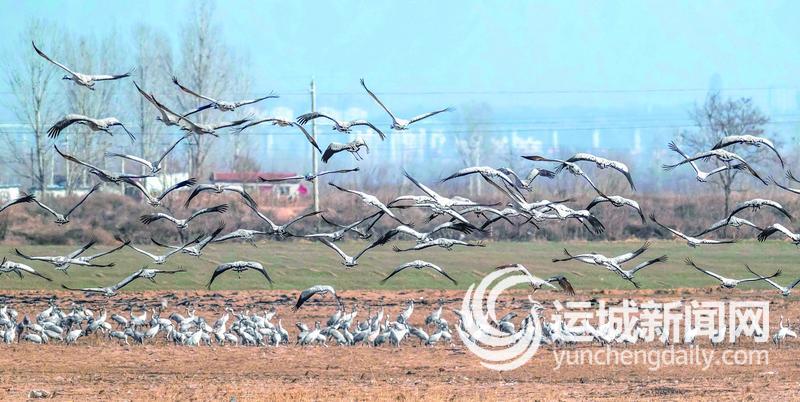 冬季时节,成群的灰鹤在万荣县黄河湿地越冬。近年来,当地不断加大黄河流域生态保护力度,黄河湿地生态环境持续向好,来此越冬的鸟类数量和种类逐年增加。 记者 茹雅 摄