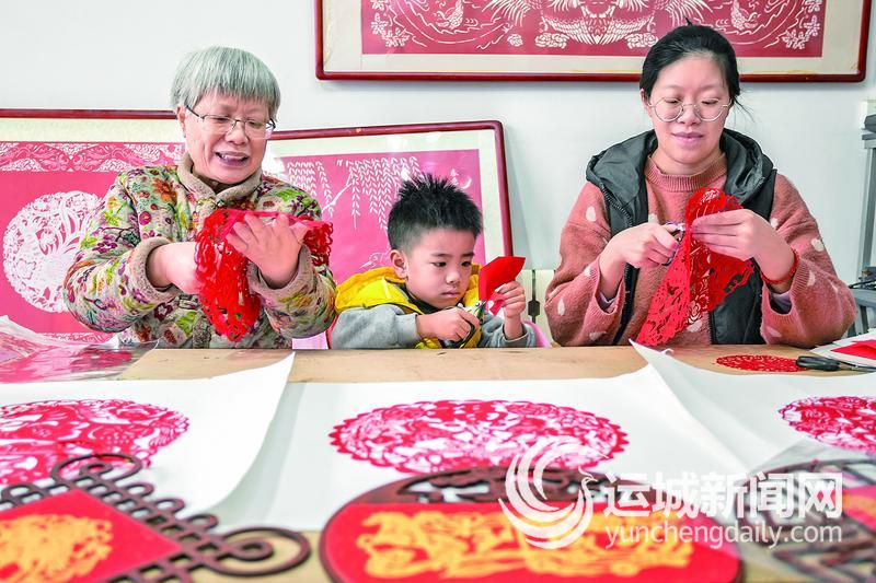 1月25日,市级非物质文化遗产(剪纸)代表性传承人李惠芳与女儿、孙子共同创作丙午马年系列剪纸作品。