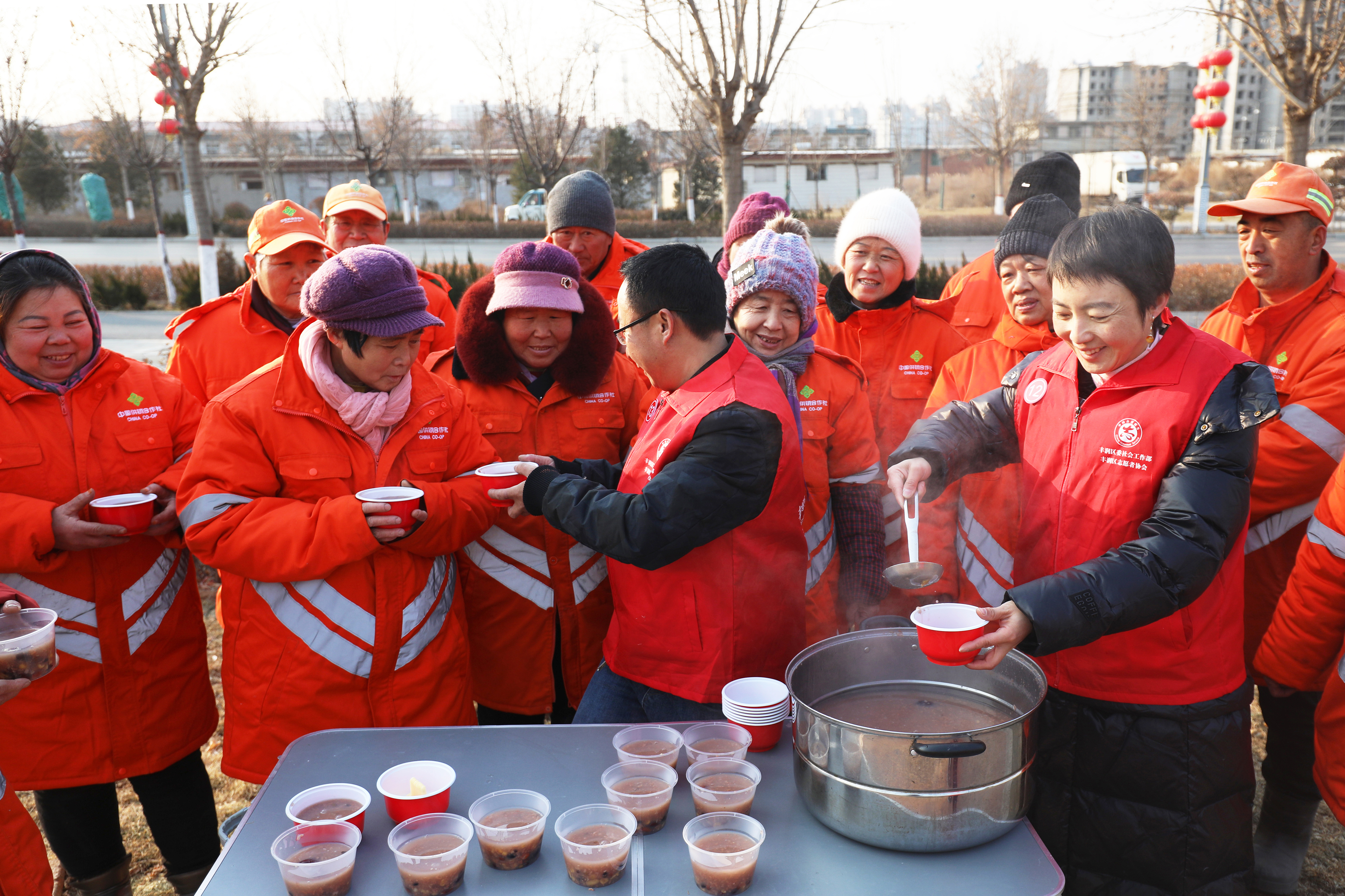 1月24日,在河北省唐山市丰润区街头,志愿者为环卫工人送上腊八粥。