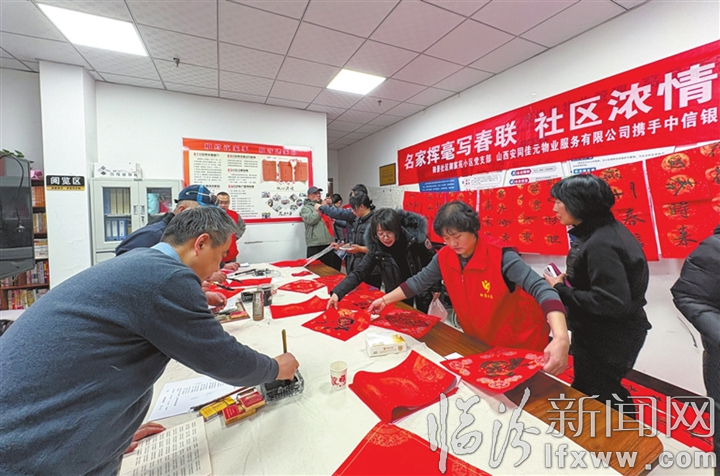 临汾新闻网讯 1月25日,在尧都区鼓楼西街街道御景社区御宸苑小区文化活动室,书法爱好者在书写春联和福字。春节脚步渐近,御宸苑小区党支部和山西安同佳元物业服务有限公司联合举办了“书写春联,社区浓情送祝福”主题活动,为居民送上温暖与祝福。记者 闫锐鹏 摄