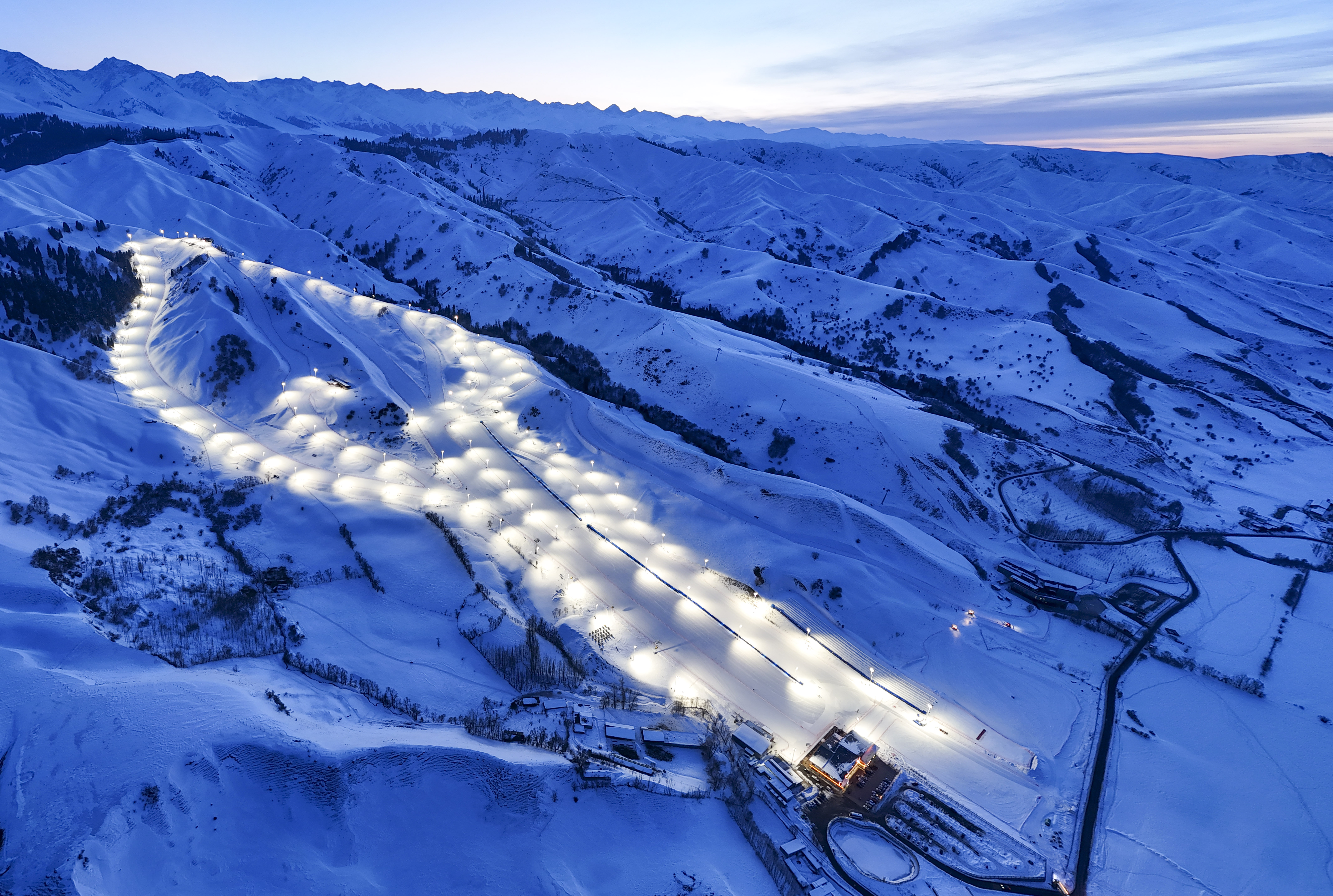 1月24日傍晚时分,新疆那拉提哈茵赛滑雪度假区亮灯,即将开启夜场营业(无人机照片)。