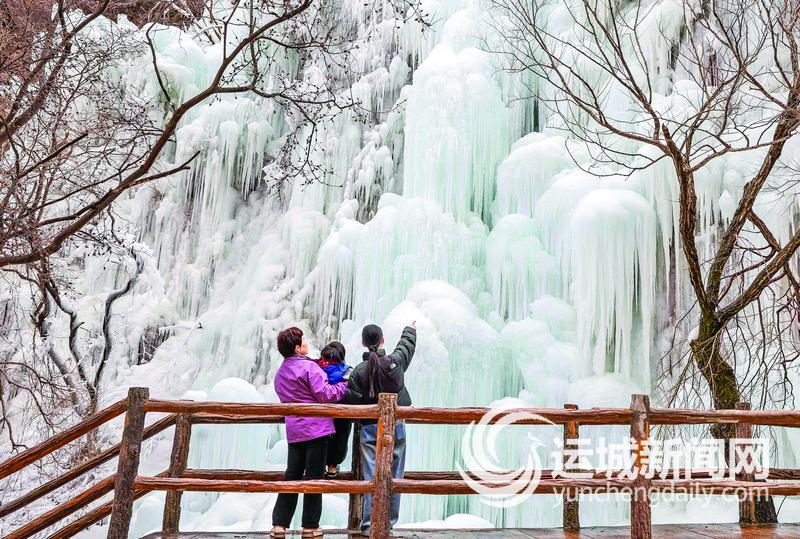 2月8日,游客在永济市五老峰景区冰挂景观区游览。