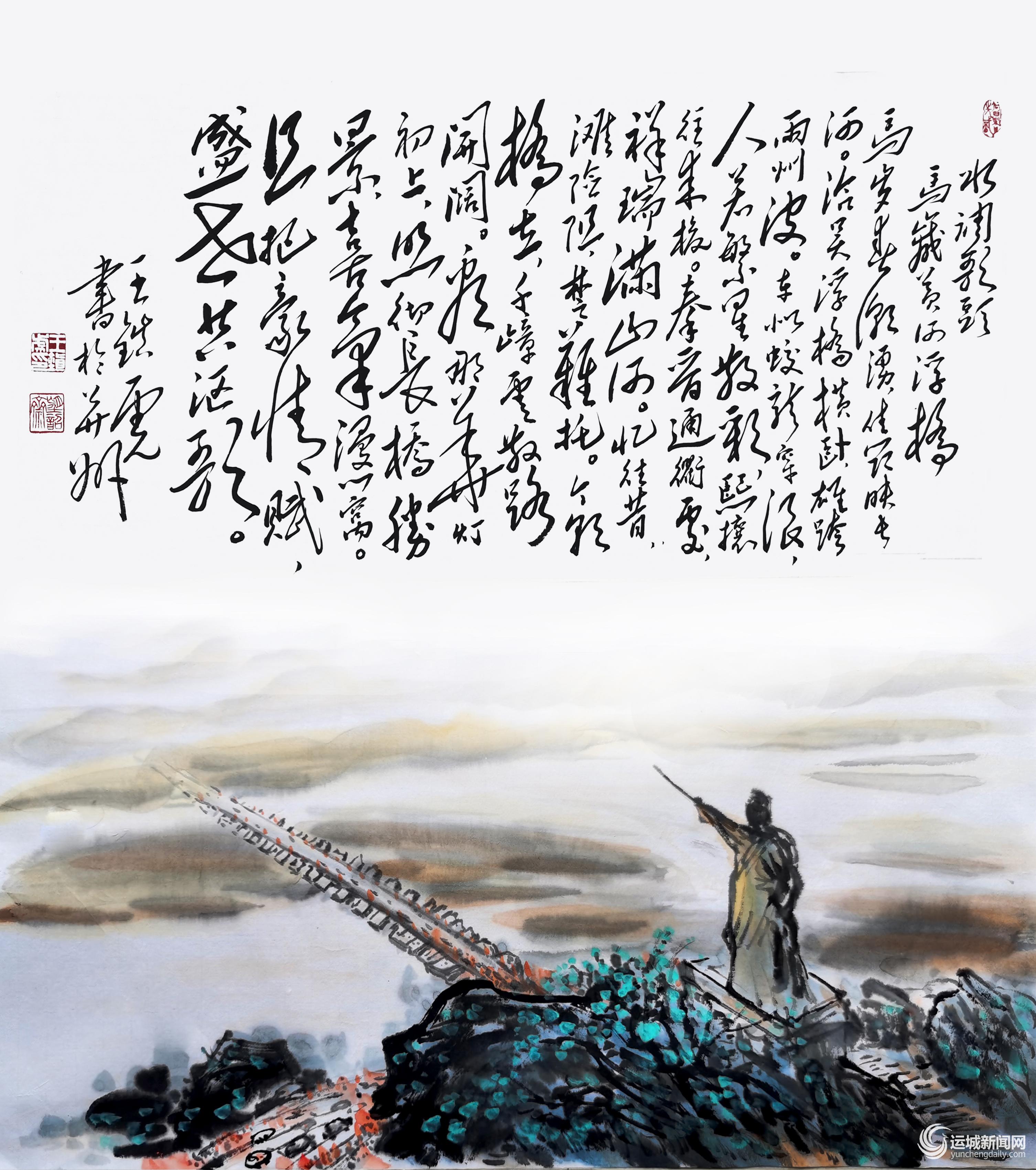 释文:马岁春潮涌,佳节映长河。洽吴浮桥横卧,雄跨两州波。车似蛟龙穿浪,人若繁星散彩,熙攘往来梭。秦晋通衢处,祥瑞满山河。 忆往昔,滩险阻,梦难托。今朝桥立,千嶂云散路开阔。看那华灯初上,照彻长桥胜景,喜气漫心窝。且把豪情赋,盛世共讴歌。