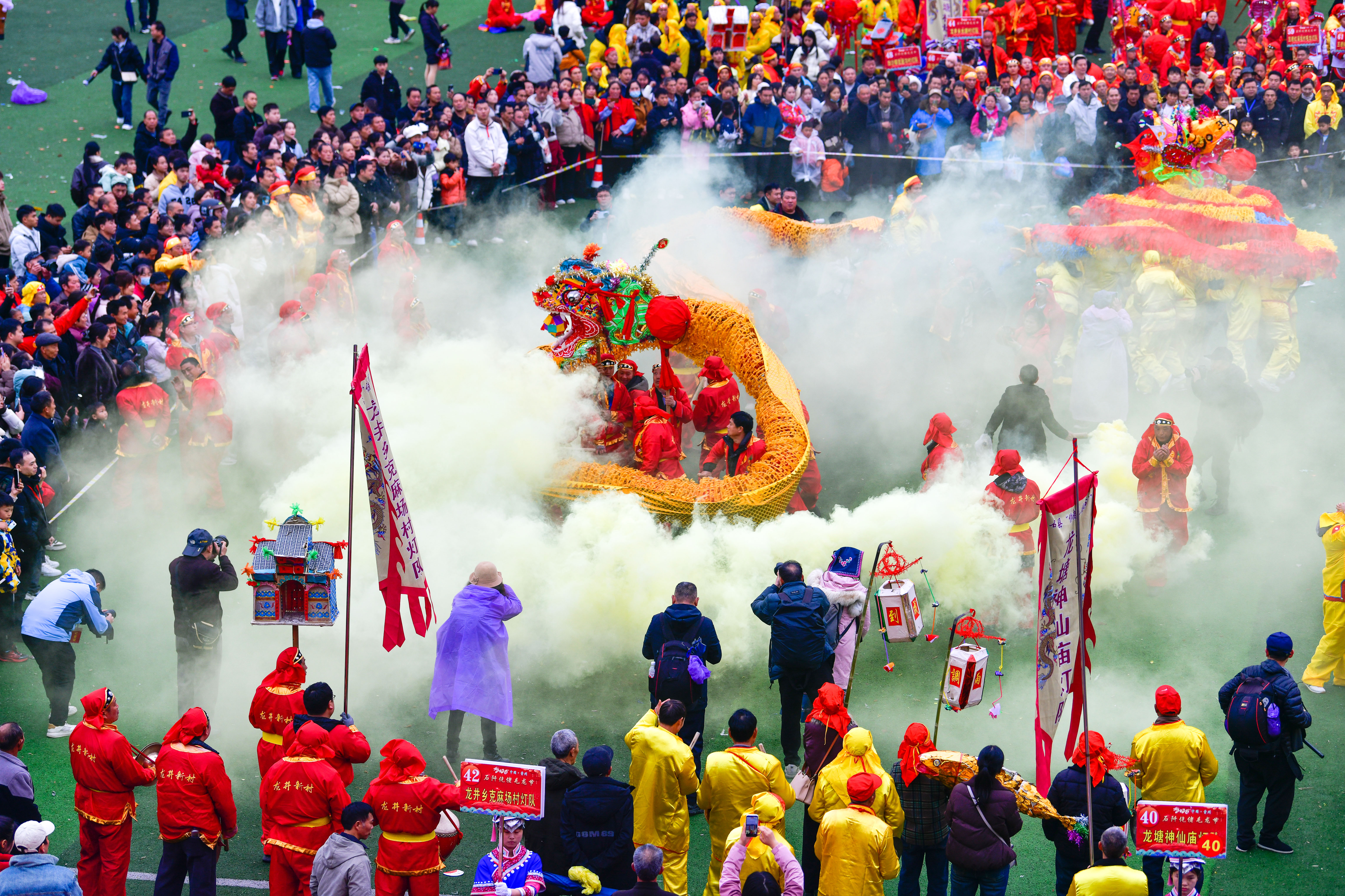 2月27日,人们在观看贵州省石阡县仡佬毛龙节舞龙大赛。