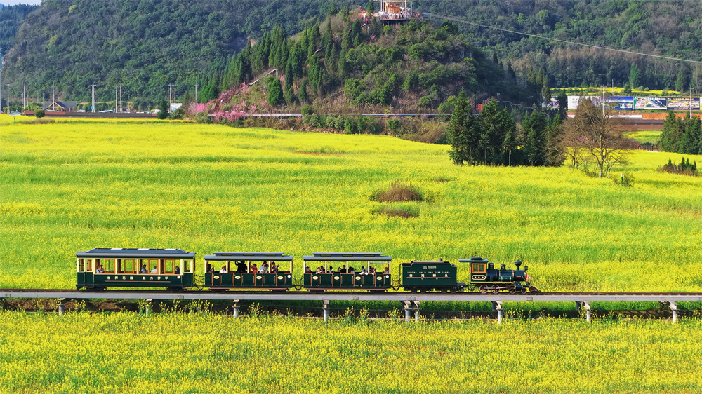 2月27日,在云南省曲靖市罗平县金鸡峰丛景区,观光小火车行驶在油菜花海中(无人机照片)。 新华社发(杨紫轩 摄)