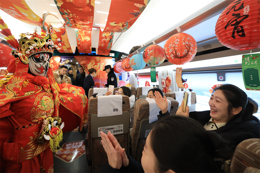 3月1日,演员在齐齐哈尔南开往天津西的G1280次列车上为旅客表演变脸。当日的车厢内张灯结彩,民族歌舞、舞狮、变脸等节目接连上演,让旅途充满节日温情。新华社发(徐 率 摄)