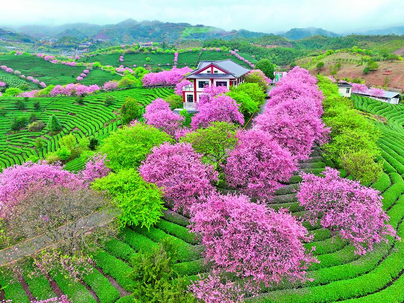 这是2月28日拍摄的福建省漳平市永福镇台品樱花茶园美景。