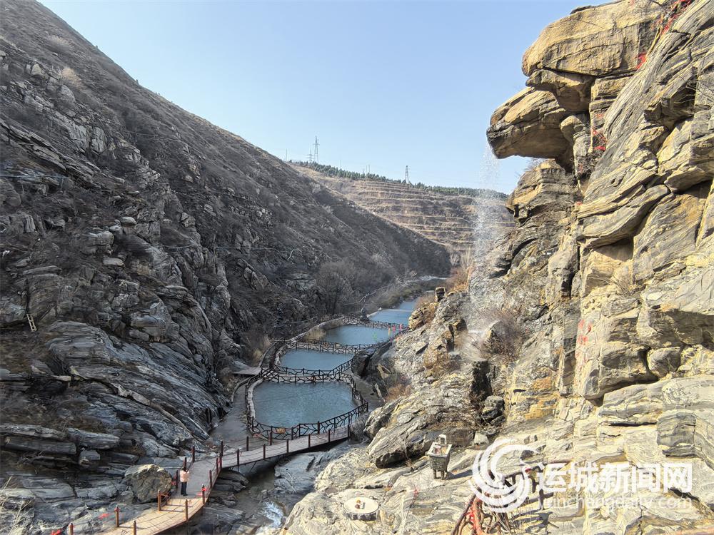 走进夏县南大里乡的“果老仙谷”景区,只见远山层叠,林木疏朗,黄土坡与枯树勾勒出苍劲轮廓;蓝天澄澈,阳光洒落,石砌崖壁上流水潺潺,层层跌落汇入碧绿深潭,静谧又灵动。一路山石、瀑布、栈道、彩旗相映成趣,山野灵秀与人文巧思相融。木栈道随势而建,彩旗轻扬,屋舍设施隐于山谷间,又带着烟火的闲适。
