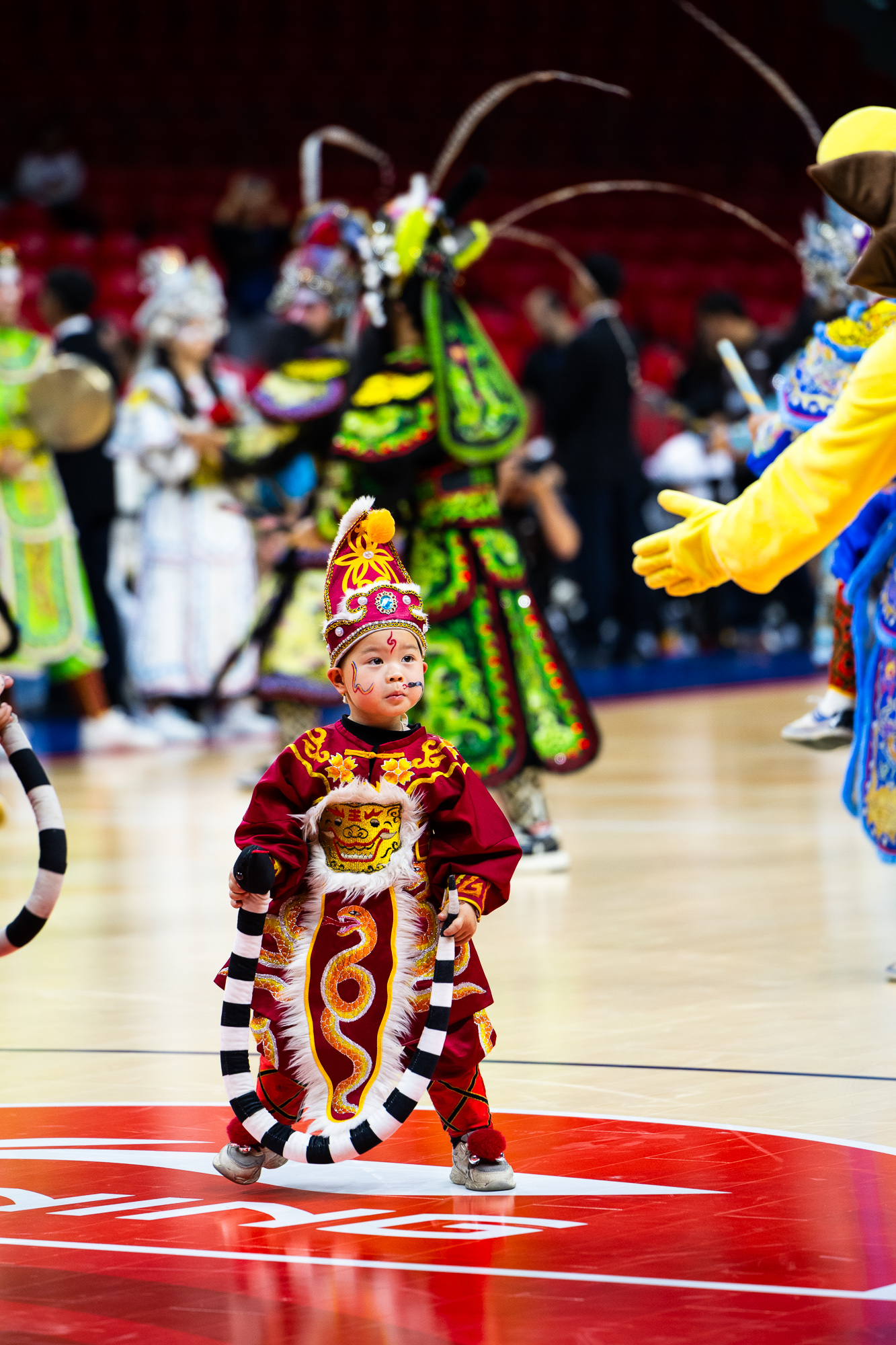 3月14日,小演员在中场休息时表演潮汕英歌舞。