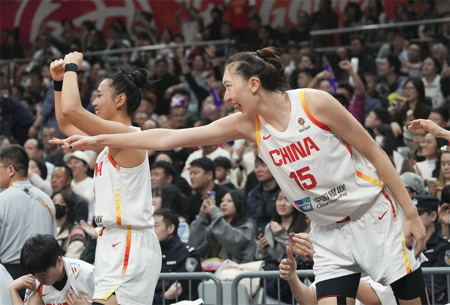 3月14日,中国队球员韩旭(右)和唐子婷庆祝队友得分。