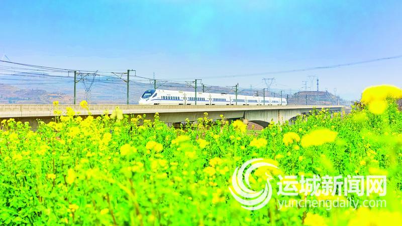 3月16日,高速列车在闻喜县境内的油菜花海中穿行。