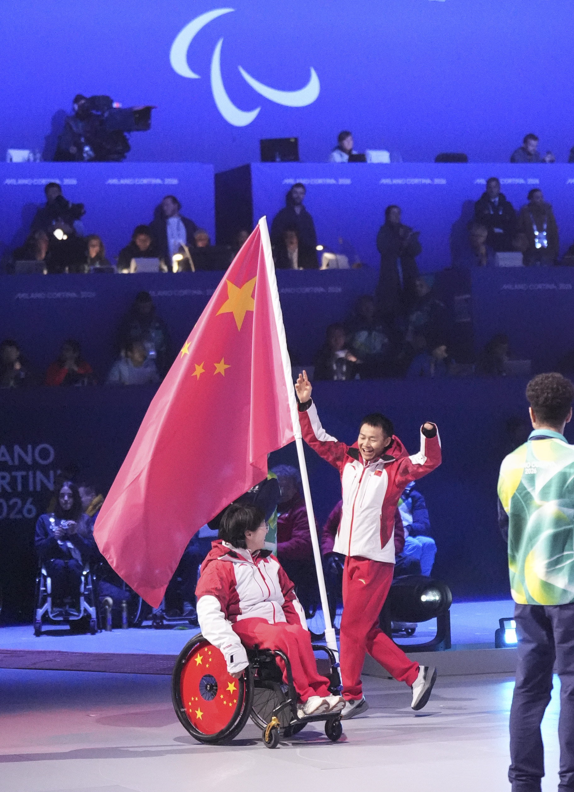 3月15日,中国体育代表团旗手蔡佳云(右)和王蒙在闭幕式上入场。