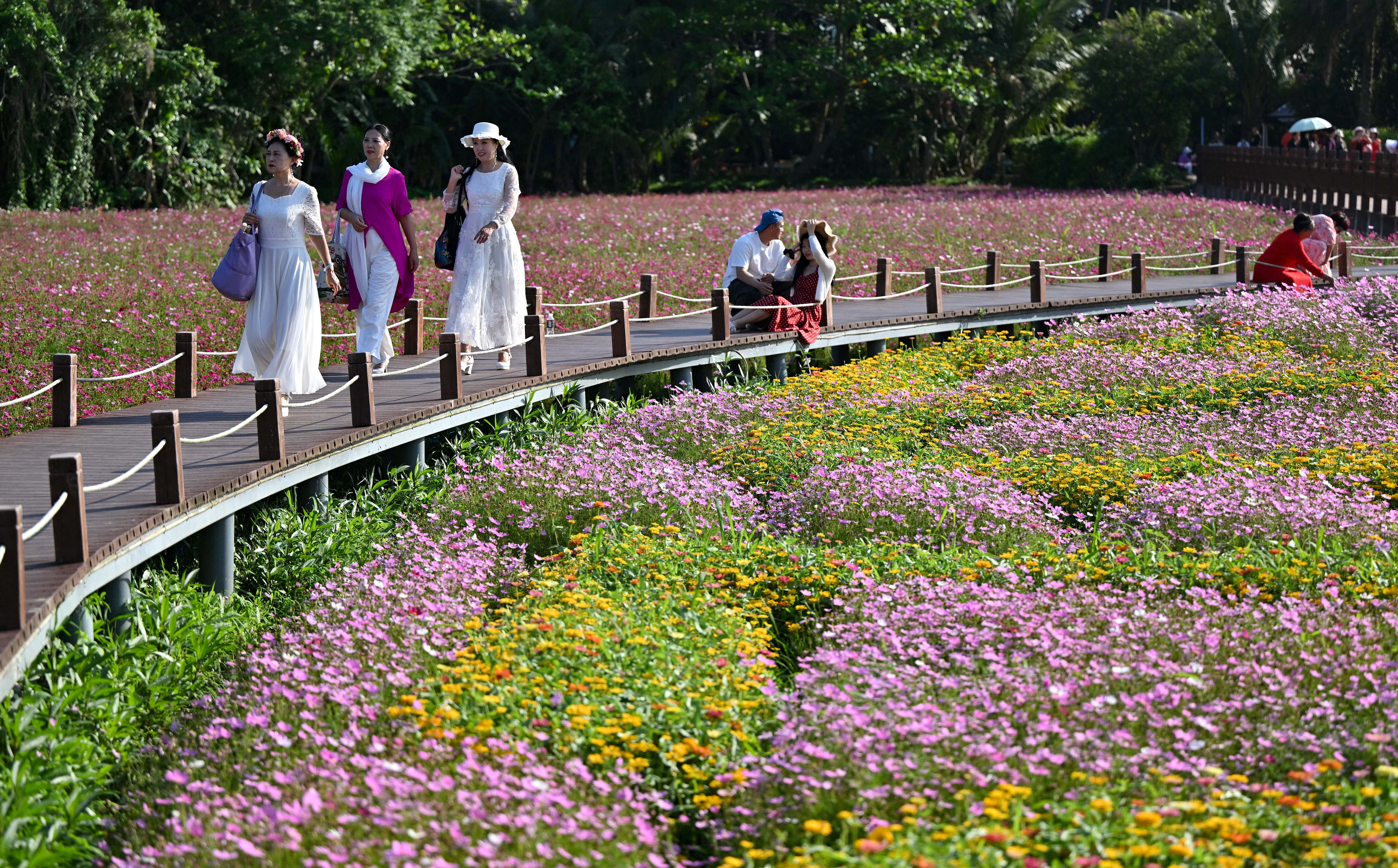 博鳌亚洲论坛2026年年会临近,琼海市博鳌镇南强村数十亩主题花海迎来盛放期,吸引游客前来踏青赏花。