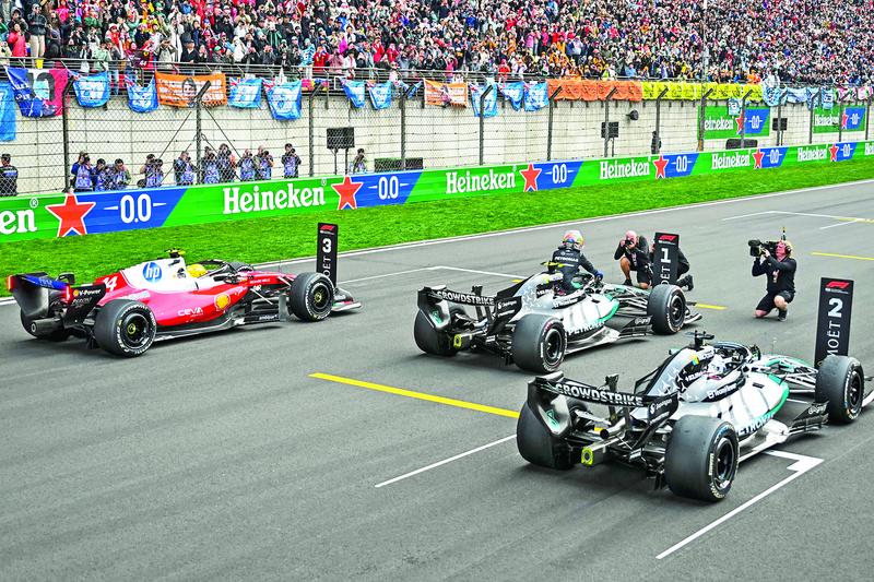 3月15日,冠军梅赛德斯车队意大利车手安东内利(中)、亚军梅赛德斯车队英国车手拉塞尔(右)与季军法拉利车队英国车手汉密尔顿抵达终点。