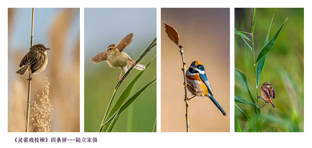 作品《灵雀戏枝丫》四条屏最为引人入胜,每一帧都凝练了鸟儿独特的姿态与神韵。它们或静立苇秆、或双翅轻扬、或昂首细枝、或悄栖绿丛,极尽生动。画面在或静或动、或素或艳的对比中,将鸟儿的灵秀与草木的生机完美融合。细腻的羽毛质感、精准的姿态刻画、恰到好处的背景虚化,不仅定格了野趣盎然的生态瞬间,更传递出摄影家对自然生灵细致入微的洞察与挚爱。