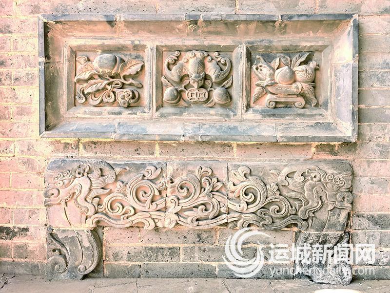 单看门房便已十分讲究:青砖墙体古朴厚重,檐下红灯笼与红绸相映,既带着古建独有的沧桑,又添了几分节庆的喜气。其上的木雕砖雕,更是将晋南工艺的精巧展现得淋漓尽致。门楣木构件雕饰繁复,花鸟、卷草纹样栩栩如生;两侧墙面嵌着扇形砖雕,牡丹配蝴蝶,寓意富贵满堂、蝶舞吉祥,刀法细腻,层次分明。墙身下段的一组三格砖雕更藏吉祥深意:石榴与佛手象征“多子多福”,蝙蝠衔古钱寓意“福在眼前”,寿桃与石榴代表“福寿双全、子孙绵延”;下方的龙纹卷草雕饰线条流畅,气韵生动,颇显晋南民间匠人的高超工艺之美。
