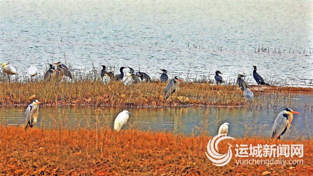 位于垣曲县的山西古城国家湿地公园里,成群的白鹭、苍鹭、鸬鹚在河边觅食嬉戏,绘就了一幅灵动的生态画卷(3月19日摄)。