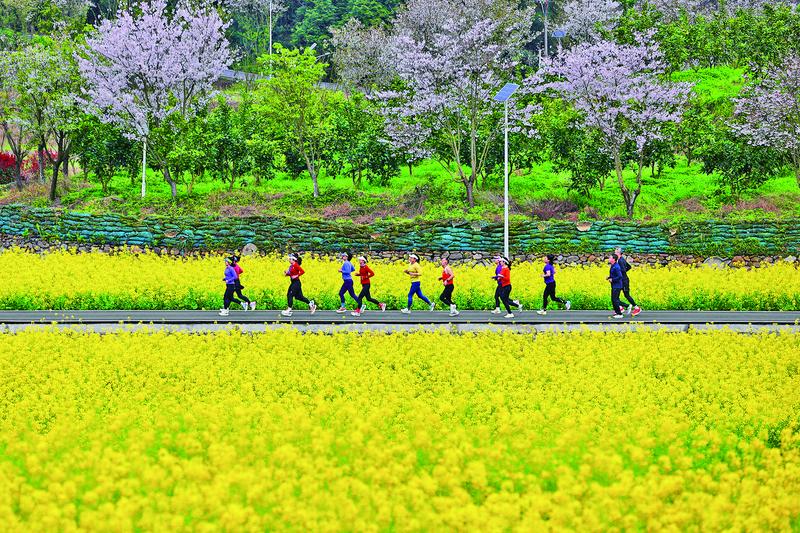 3月22日,跑步爱好者在重庆市黔江区太极镇李子村金鸡坝农业示范园区内跑步。