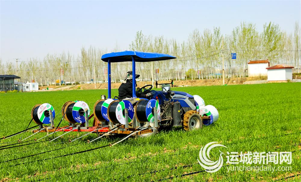 日前,夏县裴介镇一麦田里,工人操作农机在铺设节水滴灌带。